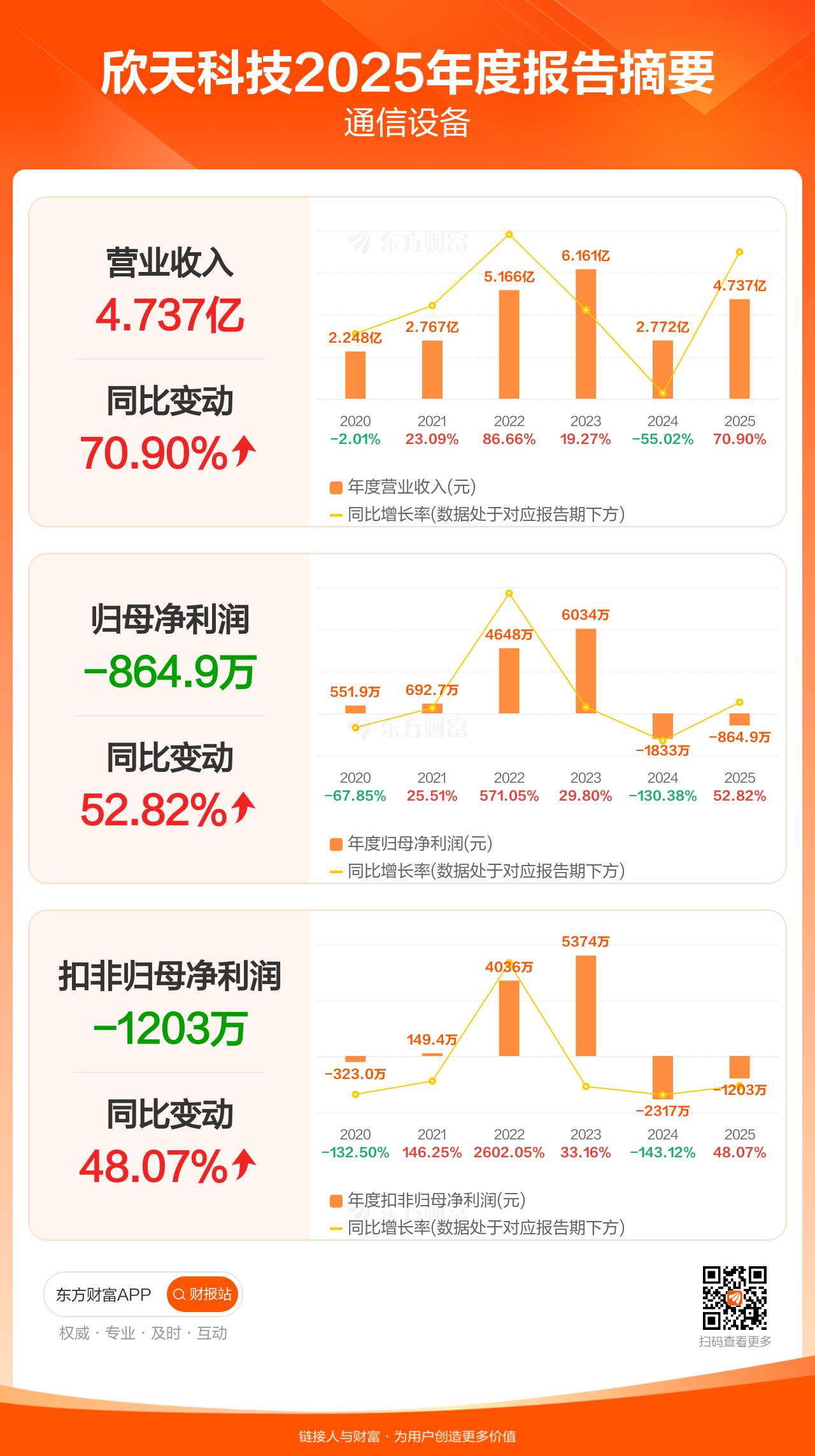 欣天科技3月31日发布2025年年报显示,公司全年实现营业收入4.74亿元,同比增长70.90%;归母净利润-864.88万元;扣非归母净利润-1203.29万元。