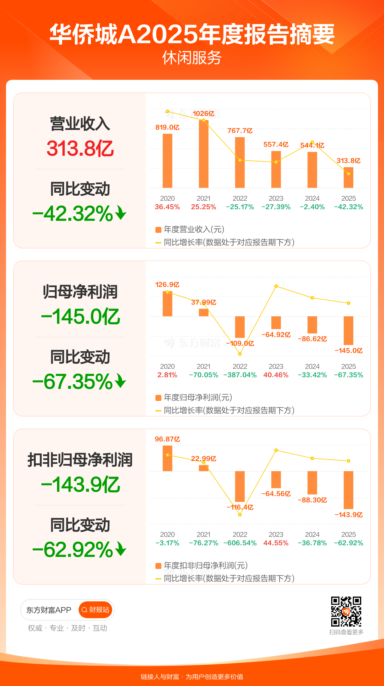 华侨城A3月31日发布2025年年报显示,公司全年实现营业收入313.81亿元,同比下滑42.32%;归母净利润-144.96亿元;扣非归母净利润-143.87亿元。