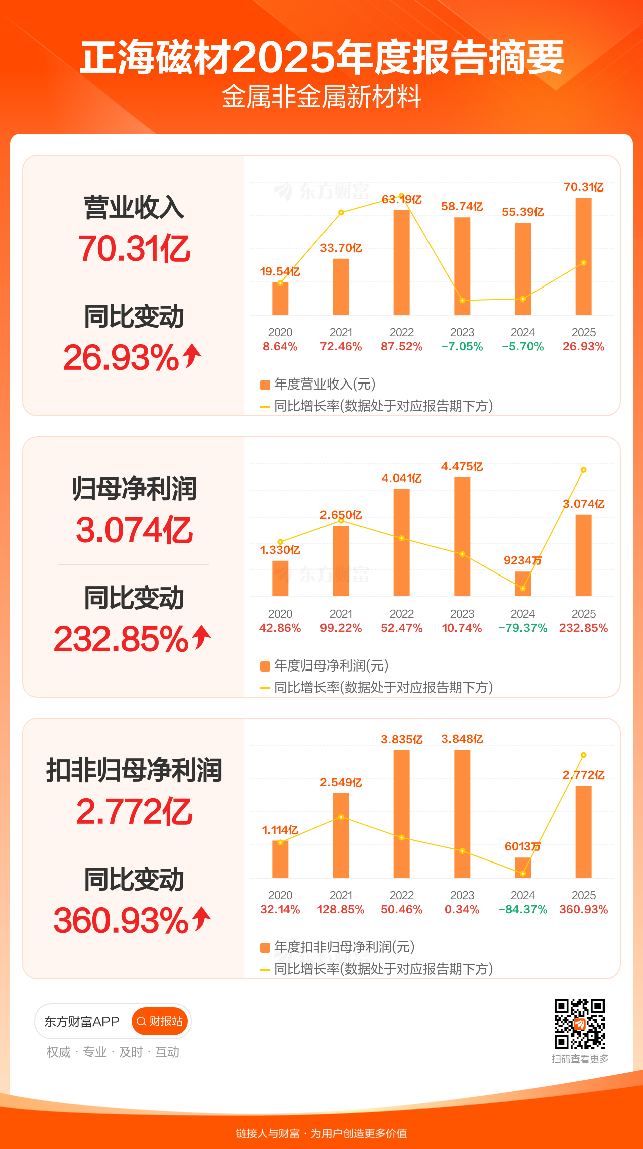 正海磁材3月31日发布2025年年报显示,公司全年实现营业收入70.31亿元,同比增长26.93%;归母净利润3.07亿元,同比增长232.85%;扣非归母净利润2.77亿元,同比增长360.93%。