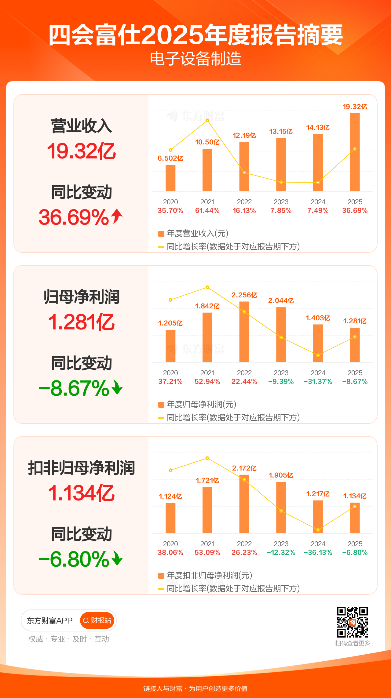 四会富仕3月31日发布2025年年报显示,公司全年实现营业收入19.32亿元,同比增长36.69%;归母净利润1.28亿元,同比下滑8.67%;扣非归母净利润1.13亿元,同比下滑6.80%。每股EPS0.88元,低于机构一致预测的1.69元。