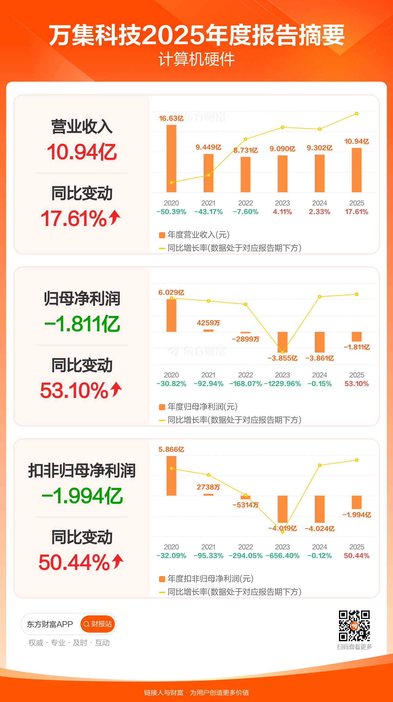 万集科技3月31日发布2025年年报显示,公司全年实现营业收入10.94亿元,同比增长17.61%;归母净利润-1.81亿元;扣非归母净利润-1.99亿元。