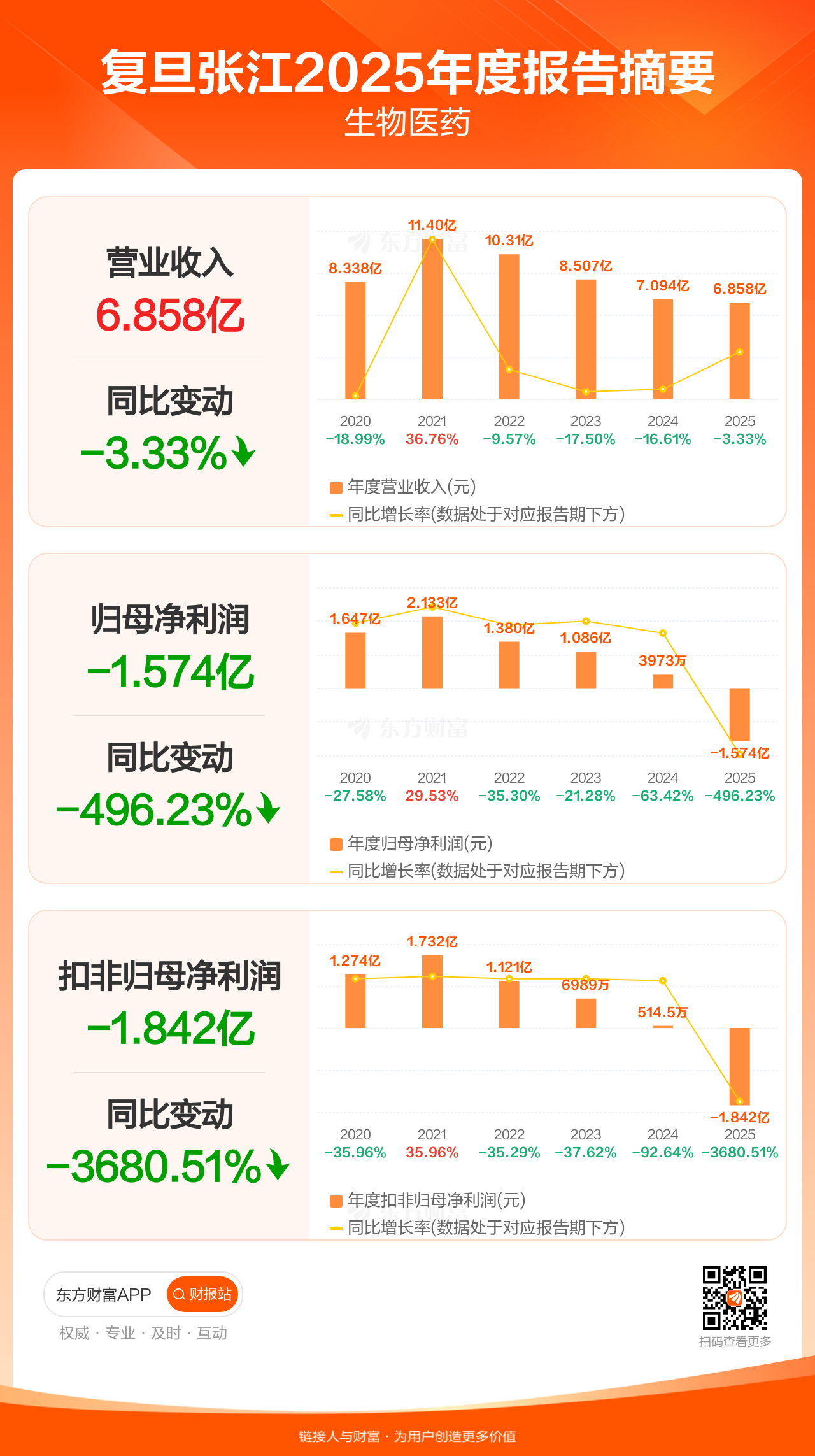 复旦张江3月31日发布2025年年报显示,公司全年实现营业收入6.86亿元,同比下滑3.33%;归母净利润-1.57亿元;扣非归母净利润-1.84亿元。