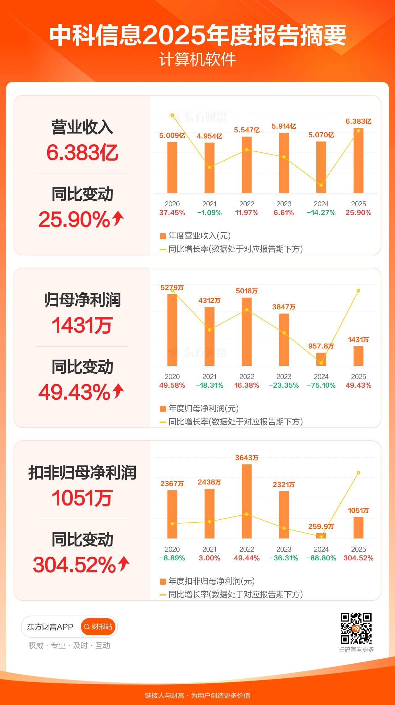 中科信息3月31日发布2025年年报显示,公司全年实现营业收入6.38亿元,同比增长25.90%;归母净利润1431.18万元,同比增长49.43%;扣非归母净利润1051.24万元,同比增长304.52%。