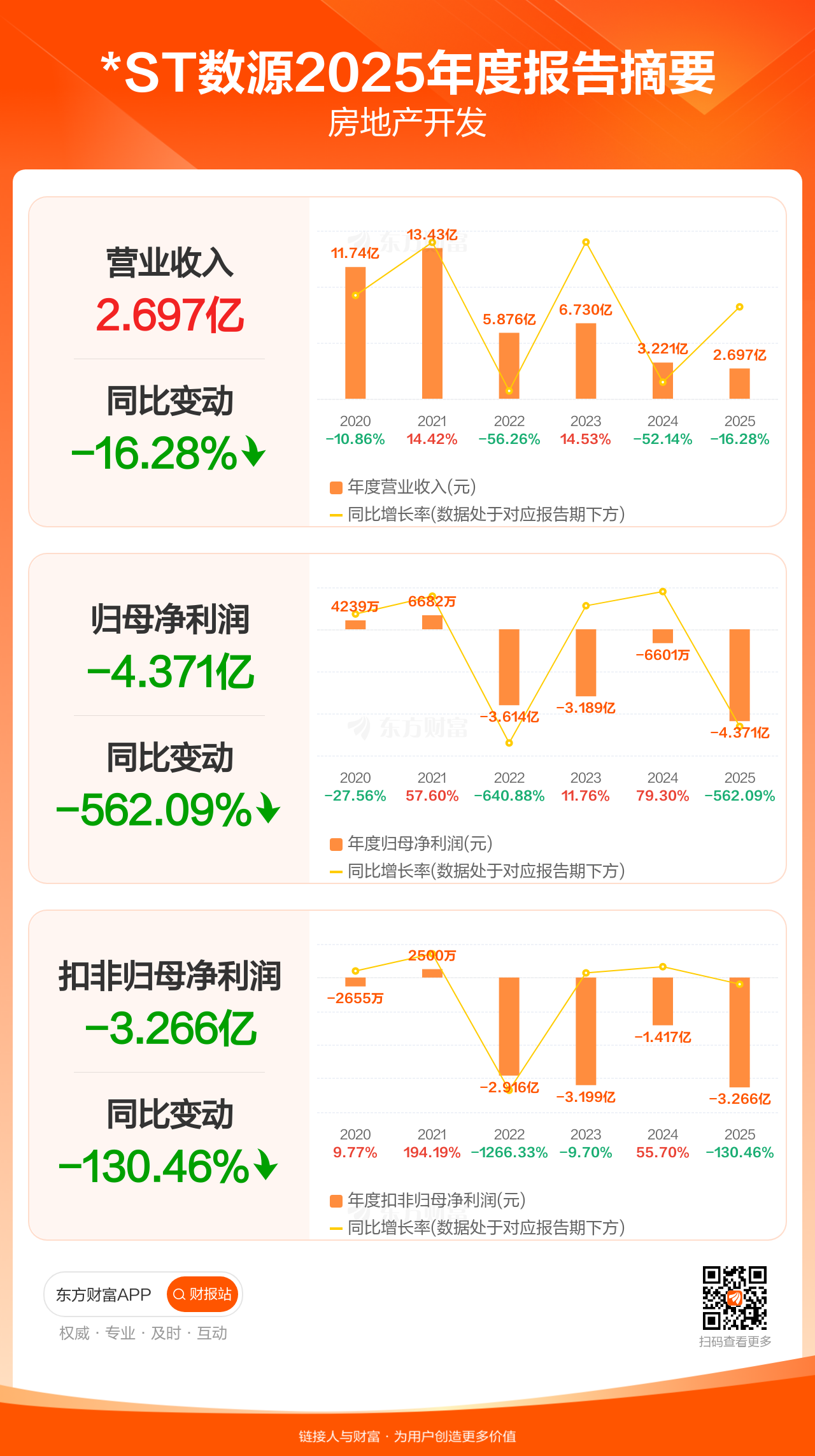 *ST数源3月31日发布2025年年报显示,公司全年实现营业收入2.70亿元,同比下滑16.28%;归母净利润-4.37亿元;扣非归母净利润-3.27亿元。