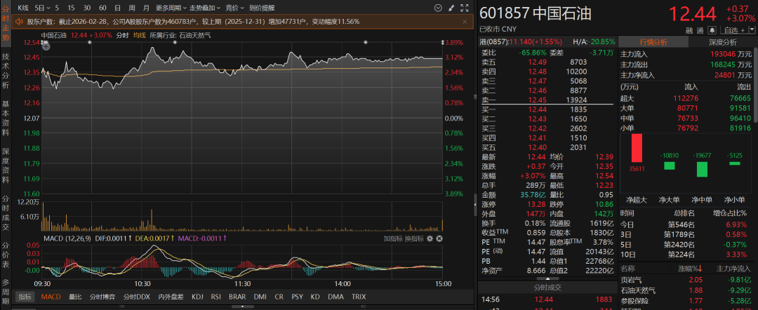 3月30日收盘,中国石油A股股价报12.44元/股,总市值达2.22万亿元。