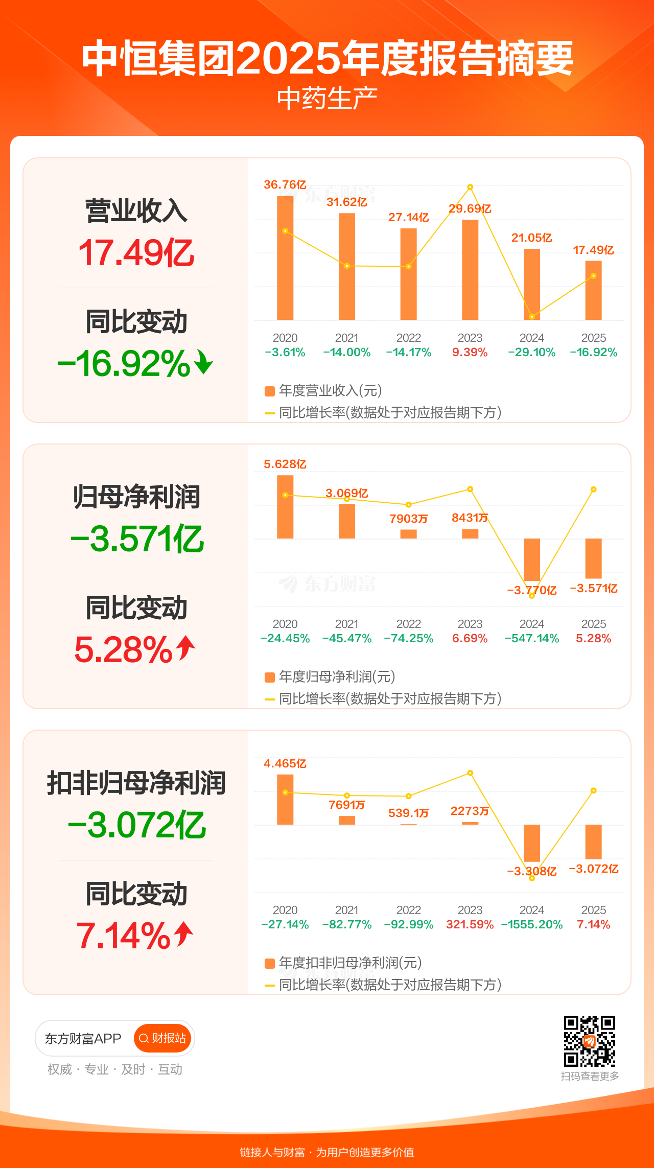 中恒集团3月31日发布2025年年报显示,公司全年实现营业收入17.49亿元,同比下滑16.92%;归母净利润-3.57亿元;扣非归母净利润-3.07亿元。