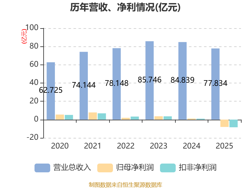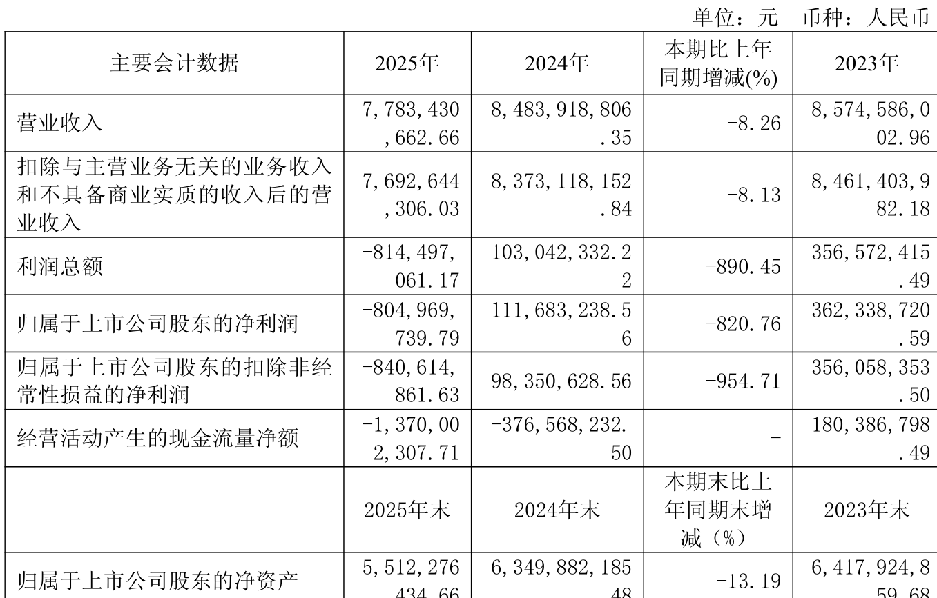 中证智能财讯抚顺特钢(600399)3月31日披露2025年年度报告。2025年,公司实现营业总收入77.83亿元,同比下降8.26%;归母净利润亏损8.05亿元,上年同期盈利1.12亿元;扣非净利润亏损8.41亿元,上年同期盈利9835.06万元;经营活动产生的现金流量净额为-13.7亿元,上年同期为-3.77亿元;报告期内,抚顺特钢基本每股收益为-0.41元,加权平均净资产收益率为-13.58%。