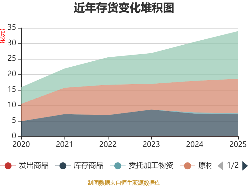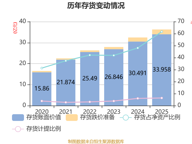 从存货变动来看,截至2025年末,公司存货账面价值为33.96亿元,占净资产的61.6%,较上年末增加3.47亿元。其中,存货跌价准备为2.29亿元,计提比例为6.33%。