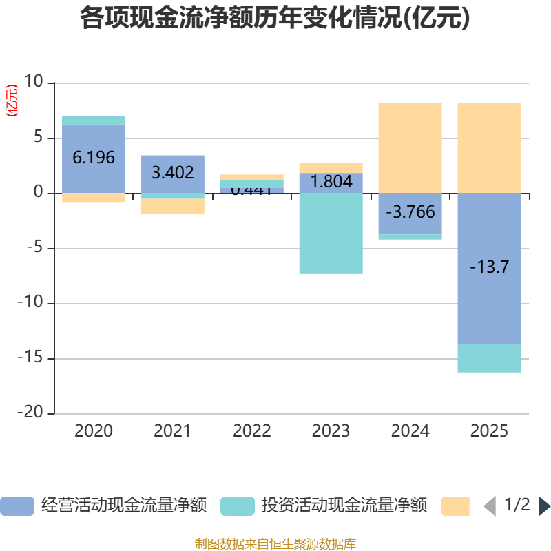 截至2025年,公司经营活动现金流净额为-13.7亿元,同比减少9.93亿元;筹资活动现金流净额8.14亿元,同比增加3.02万元;投资活动现金流净额-2.6亿元,上年同期为-4656.6万元。