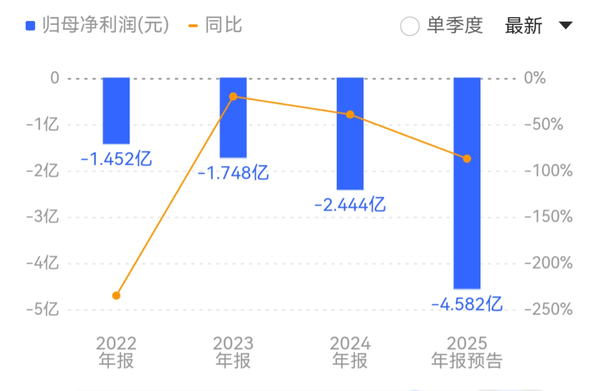 财报显示,2022年至2024年,公司营收分别为25.10亿元、22.66亿元、21.33亿元,同比分别下降4.20%、9.74%、5.86%;同期归母净利润分别为-1.45亿元、-1.75亿元、-2.44亿元,同比分别下降235.32%、20.37%、39.81%。