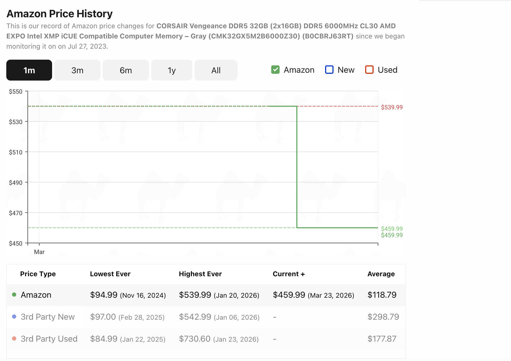 财联社记者于camelcamelcamel平台查询美国亚马逊网站上一款海盗船的复仇者(VENGEANCE)系列DDR5 32GB内存条的价格发现,该产品在一周前从539.99美元降价80美元-459.99美元。
