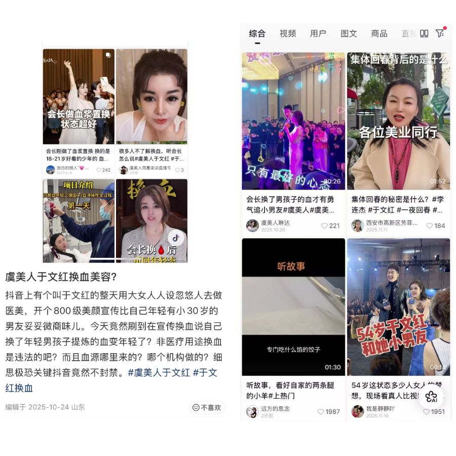 上述行政处罚外,21世纪经济报道记者发现,2025年底,某短视频平台上多个以“虞美人”为前缀的账号发布相关言论,其中“会长换了男孩子的血才有勇气追小男友”等说法引发社交平台广泛讨论。
