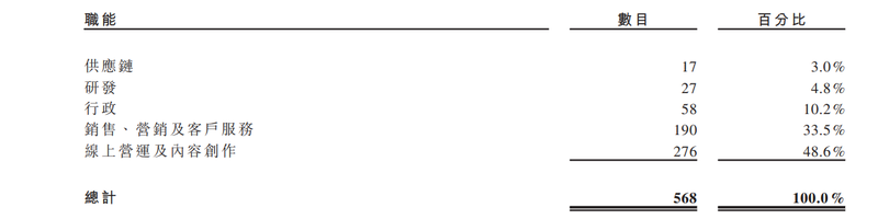 截至2025年12月31日,该公司共有568名全职雇员。按职能划分,研发团队由27名雇员组成,占比约4.8%。相比之下,负责销售、营销及客户服务的雇员有190名,占比33.5%;负责线上运营及内容创作的雇员占比最多,达48.6%。