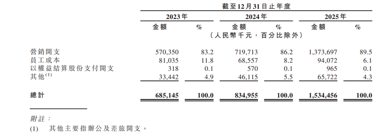 对于2025年超80%的销售及分销开支增幅,该公司解释称,主要原因是把握增长机遇,持续投资渠道扩张及品牌建设,营销开支由2024年的7.197亿元增至2025年的13.737亿元,在2025年公司总收入中的占比约55%。