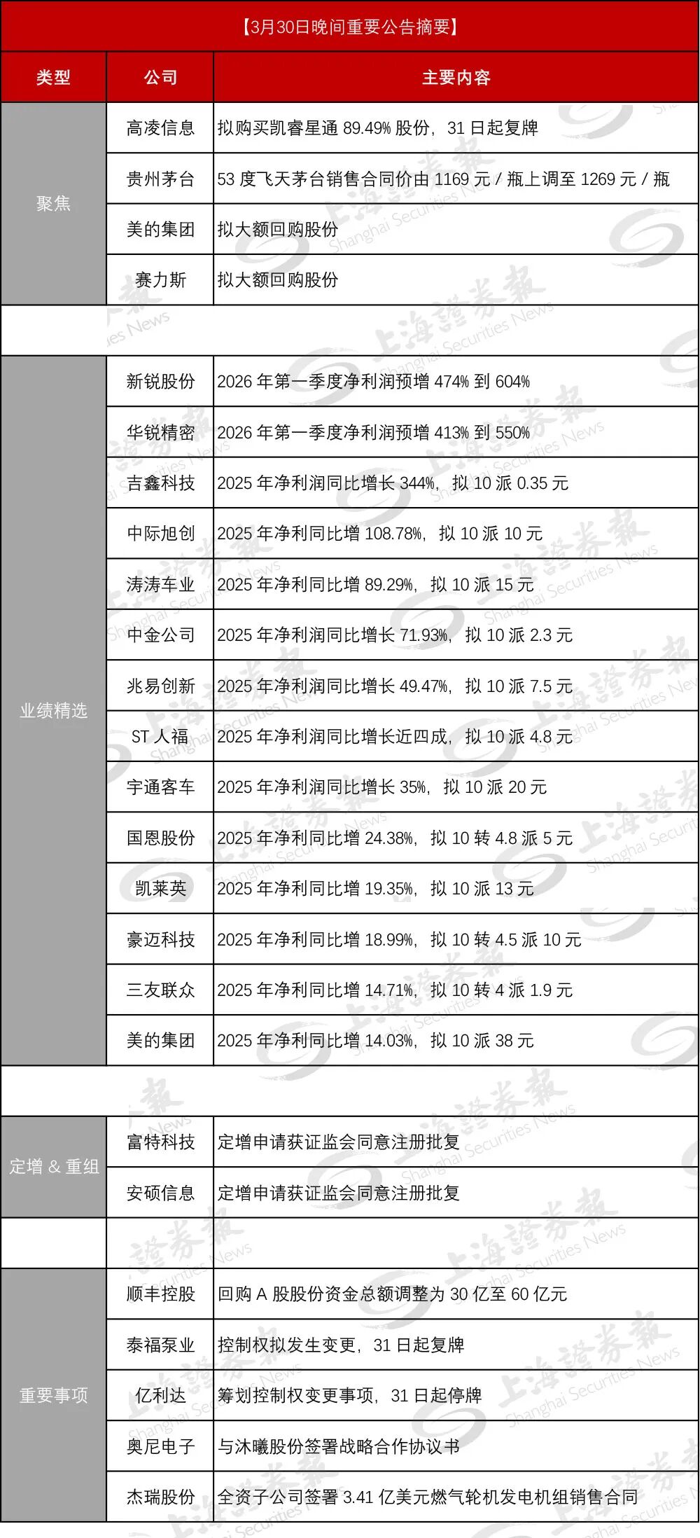 ST人福:披露年报。公司2025年实现营业收入23,962,010,164.64元,同比下降5.79%;归属于上市公司股东的净利润1,855,334,433.96元,同比增长39.53%;基本每股收益1.14元。经董事会审议,公司2025年度拟以实施权益分派股权登记日登记的公司总股本为基数,向全体股东每10股派发现金红利4.80元(含税),本年度不实施资本公积金转增股本方案。