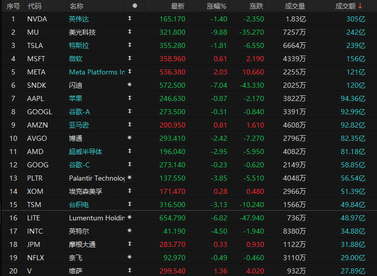 第2名内存概念股美光科技收跌9.88%,成交243亿美元。该股本月已下跌超过20%。日前谷歌发布TurboQuant技术,引发全球半导体板块集体下跌,市场担忧AI对内存的需求弹性下降。