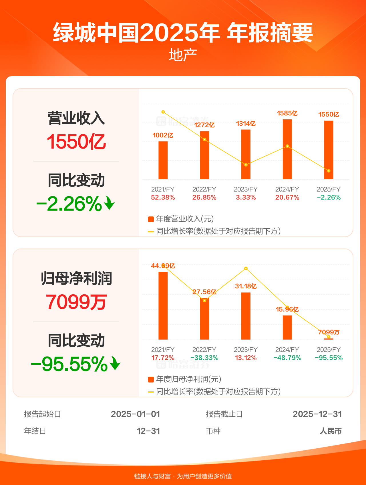 绿城中国3月31日发布年报业绩,截至2025年12月31日的12个月内,该公司营业收入1549.66亿人民币,同比减少2.26%;公司权益持有人应占溢利(归母净利润)7098.90万人民币,同比减少95.55%,低于机构一致预测的5.47亿人民币。
