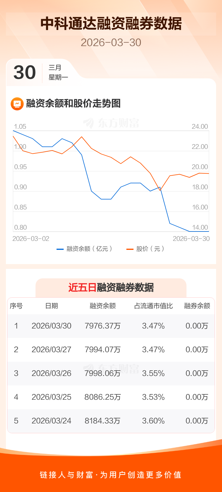 交易所最新数据显示,中科通达于2026年3月30日获融资买入134.64万元,融资偿还152.34万元,当日融资净偿还17.7万元。目前,该股融资余额7976.37万,占流通市值比例为3.47%。