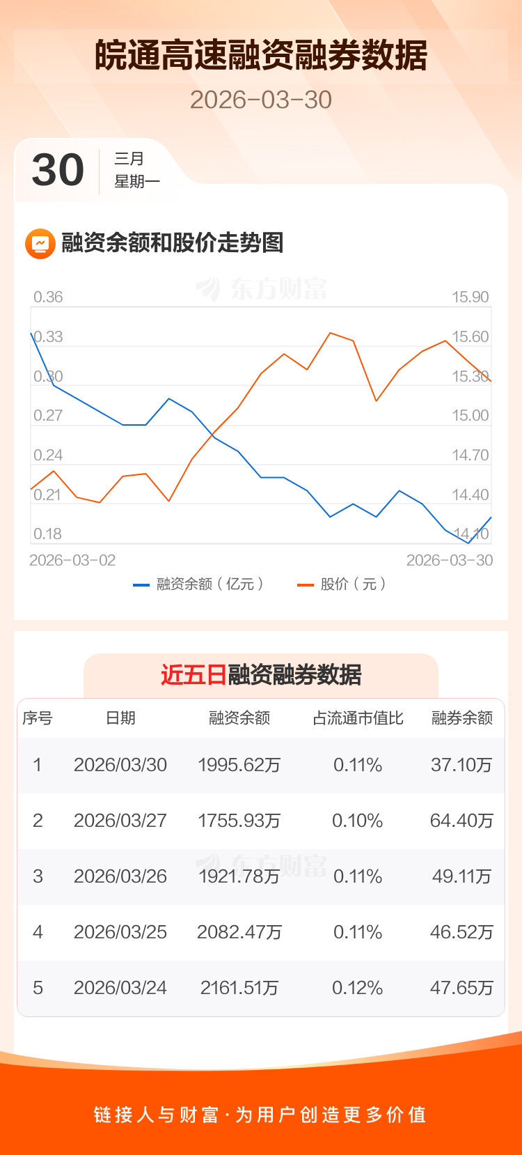 交易所最新数据显示,皖通高速于2026年3月30日获融资买入584.12万元,融资偿还344.43万元,当日融资净买入239.69万元。目前,该股融资余额1995.62万,占流通市值比例为0.11%。