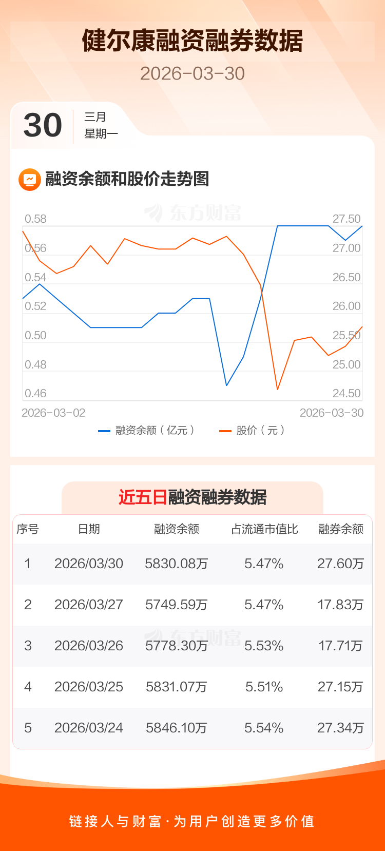 交易所最新数据显示,健尔康于2026年3月30日获融资买入151.12万元,融资偿还70.63万元,当日融资净买入80.49万元。目前,该股融资余额5830.08万,占流通市值比例为5.47%。