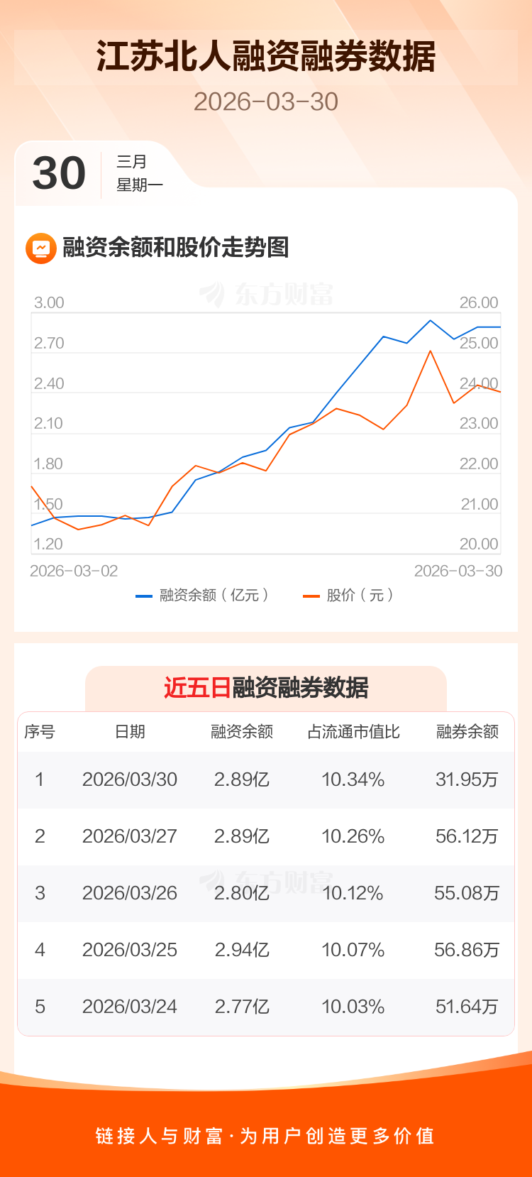 交易所最新数据显示,江苏北人于2026年3月30日获融资买入1088.27万元,融资偿还1057.78万元,当日融资净买入30.49万元。目前,该股融资余额2.89亿,占流通市值比例为10.34%。