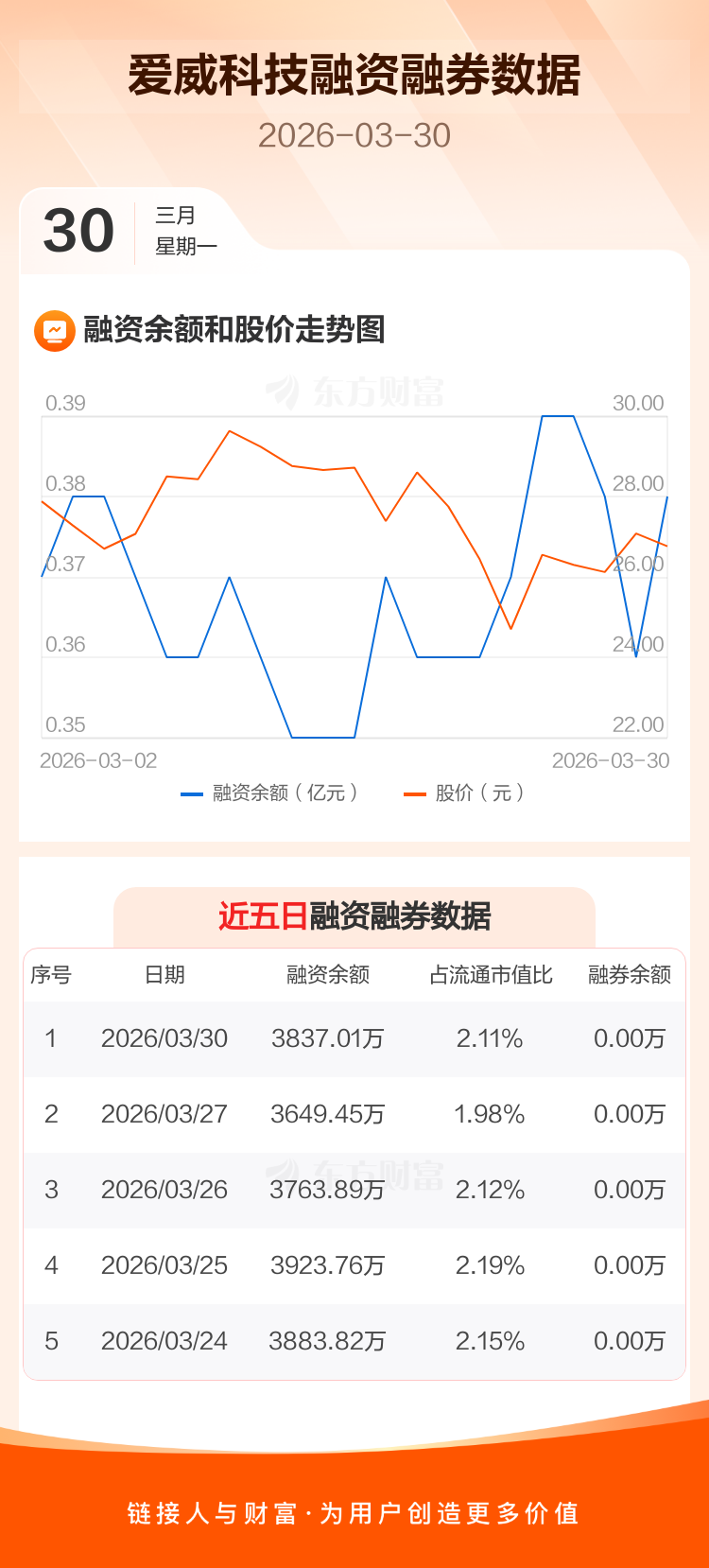 交易所最新数据显示,爱威科技于2026年3月30日获融资买入375.99万元,融资偿还188.43万元,当日融资净买入187.56万元。目前,该股融资余额3837.01万,占流通市值比例为2.11%。