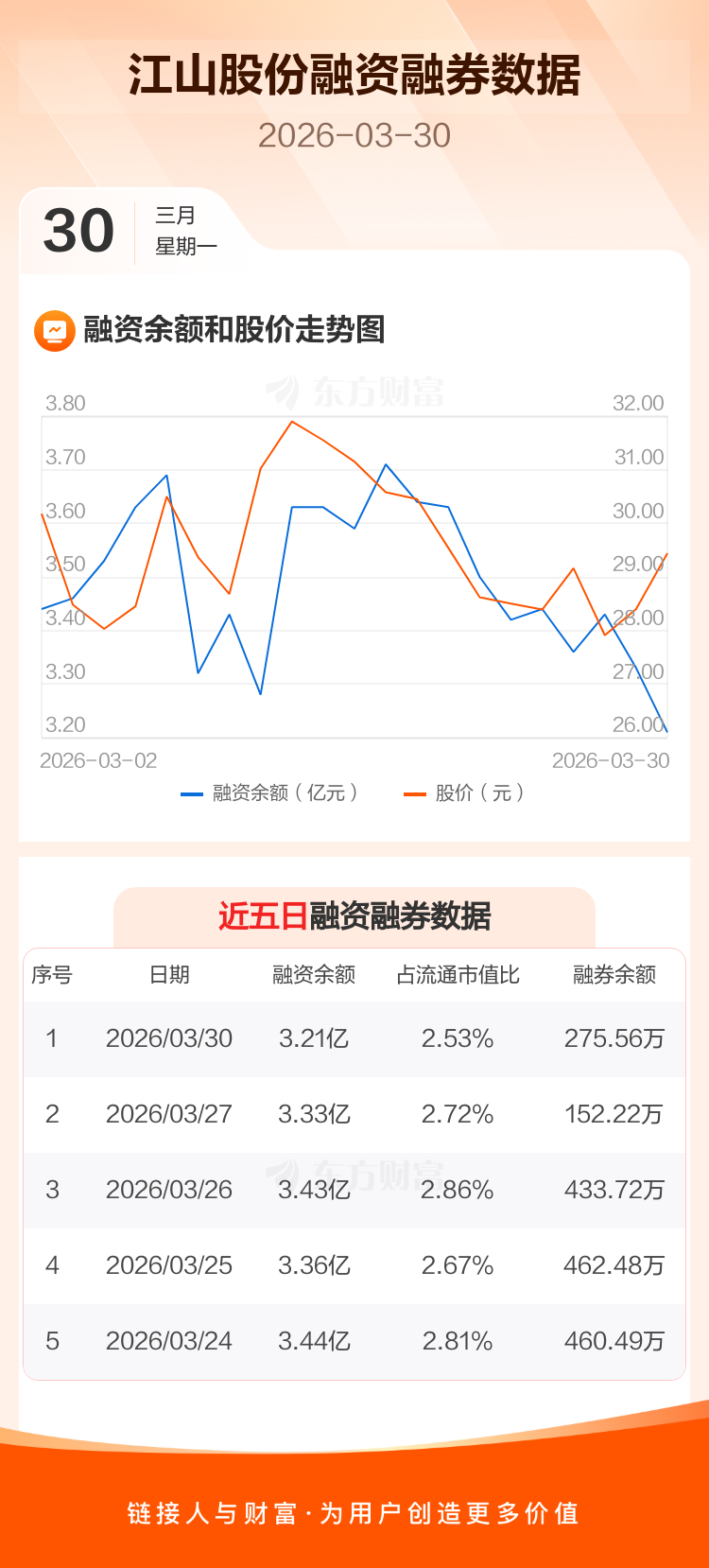交易所最新数据显示,江山股份于2026年3月30日获融资买入1349.66万元,融资偿还2567.27万元,当日融资净偿还1217.62万元。目前,该股融资余额3.21亿,占流通市值比例为2.53%。