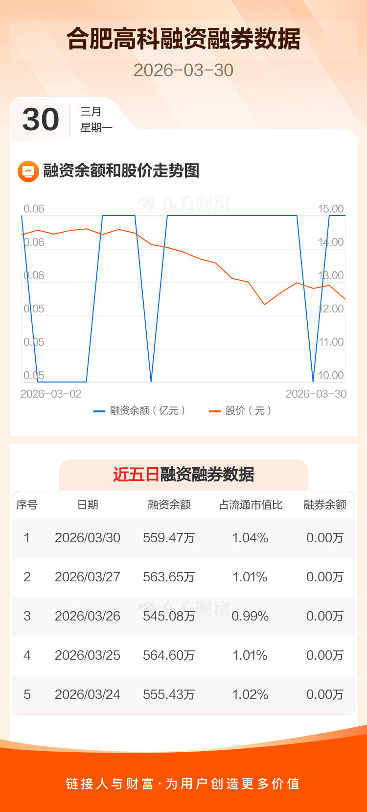 交易所最新数据显示,合肥高科于2026年3月30日获融资买入80.00万元,融资偿还84.19万元,当日融资净偿还4.19万元。目前,该股融资余额559.47万,占流通市值比例为1.04%。