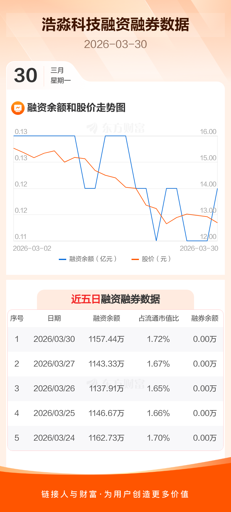 交易所最新数据显示,浩淼科技于2026年3月30日获融资买入30.93万元,融资偿还16.82万元,当日融资净买入14.11万元。目前,该股融资余额1157.44万,占流通市值比例为1.72%。