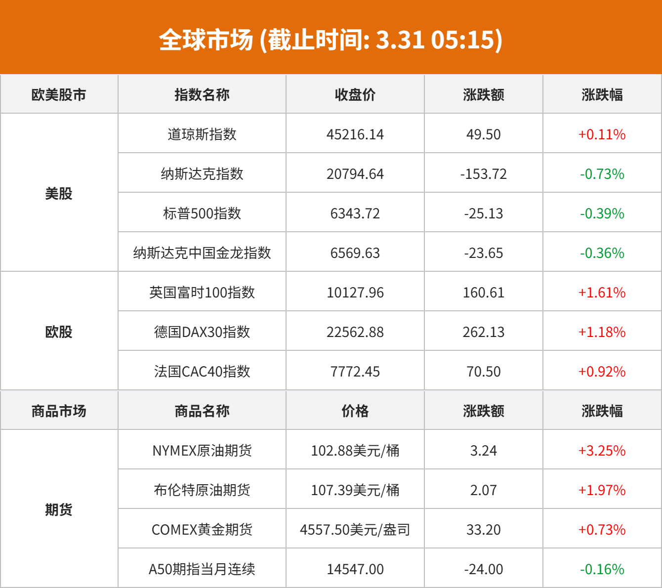 商品市场:国际油价03月30日上涨。截至当天收盘,纽约商品交易所WTI原油期货当月连续合约上涨5.37美元,收于每桶105.01美元,涨幅为5.39%。COMEX黄金期货当月连续合约上涨16.10美元,涨幅0.36%,报4540.4美元/盎司。COMEX白银期货当月连续合约上涨0.38美元,涨幅0.55%,报70.18美元/盎司。现货黄金上涨18.18美元,涨幅0.40%,报4511.17美元/盎司。现货白银上涨0.31美元,涨幅0.44%,报70.1美元/盎司。