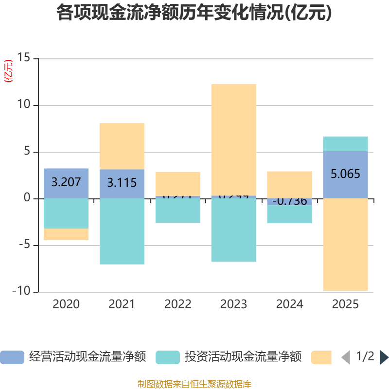 截至2025年,公司经营活动现金流净额为5.07亿元,同比增加5.8亿元;筹资活动现金流净额-9.9亿元,同比减少12.78亿元;投资活动现金流净额1.57亿元,上年同期为-1.92亿元。