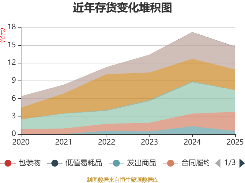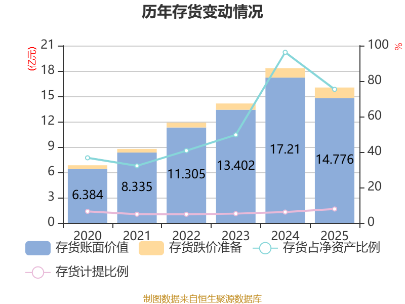 从存货变动来看,截至2025年末,公司存货账面价值为14.78亿元,占净资产的75.34%,较上年末减少2.43亿元。其中,存货跌价准备为1.26亿元,计提比例为7.86%。