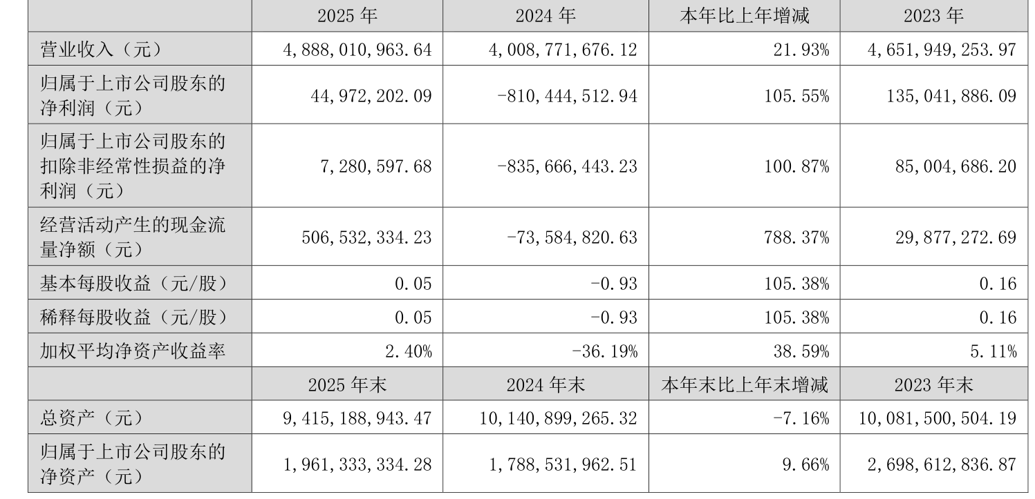 中证智能财讯埃斯顿(002747)3月31日披露2025年年度报告。2025年,公司实现营业总收入48.88亿元,同比增长21.93%;归母净利润4497.22万元,同比扭亏;扣非净利润728.06万元,同比扭亏;经营活动产生的现金流量净额为5.07亿元,上年同期为-7358.48万元;报告期内,埃斯顿基本每股收益为0.05元,加权平均净资产收益率为2.40%。