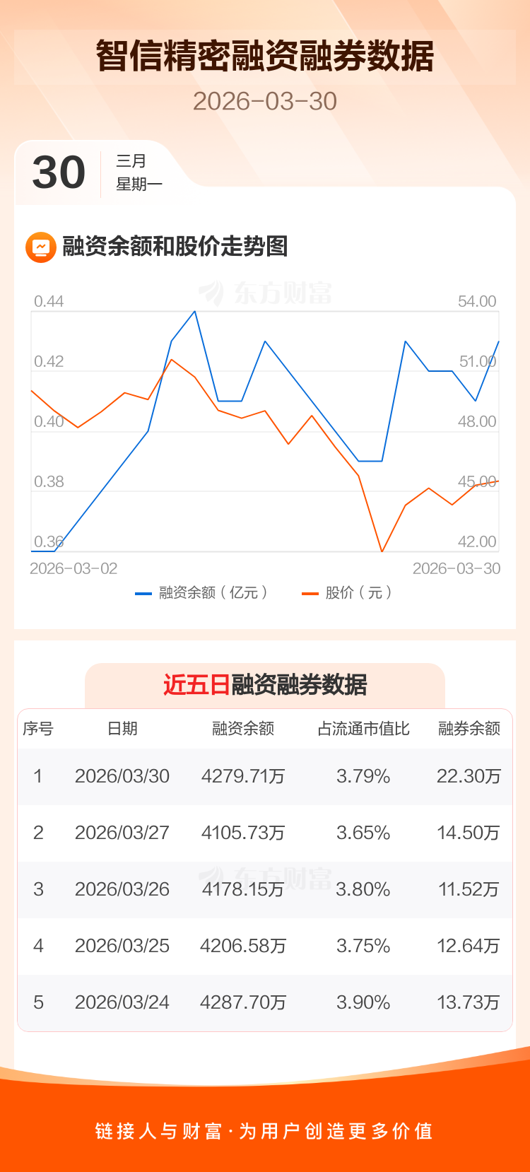 交易所最新数据显示,智信精密于2026年3月30日获融资买入420.58万元,融资偿还246.60万元,当日融资净买入173.98万元。目前,该股融资余额4279.71万,占流通市值比例为3.79%。
