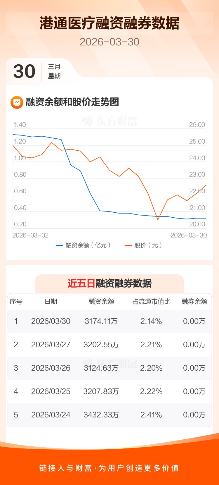 交易所最新数据显示,港通医疗于2026年3月30日获融资买入439.81万元,融资偿还468.25万元,当日融资净偿还28.44万元。目前,该股融资余额3174.12万,占流通市值比例为2.14%。