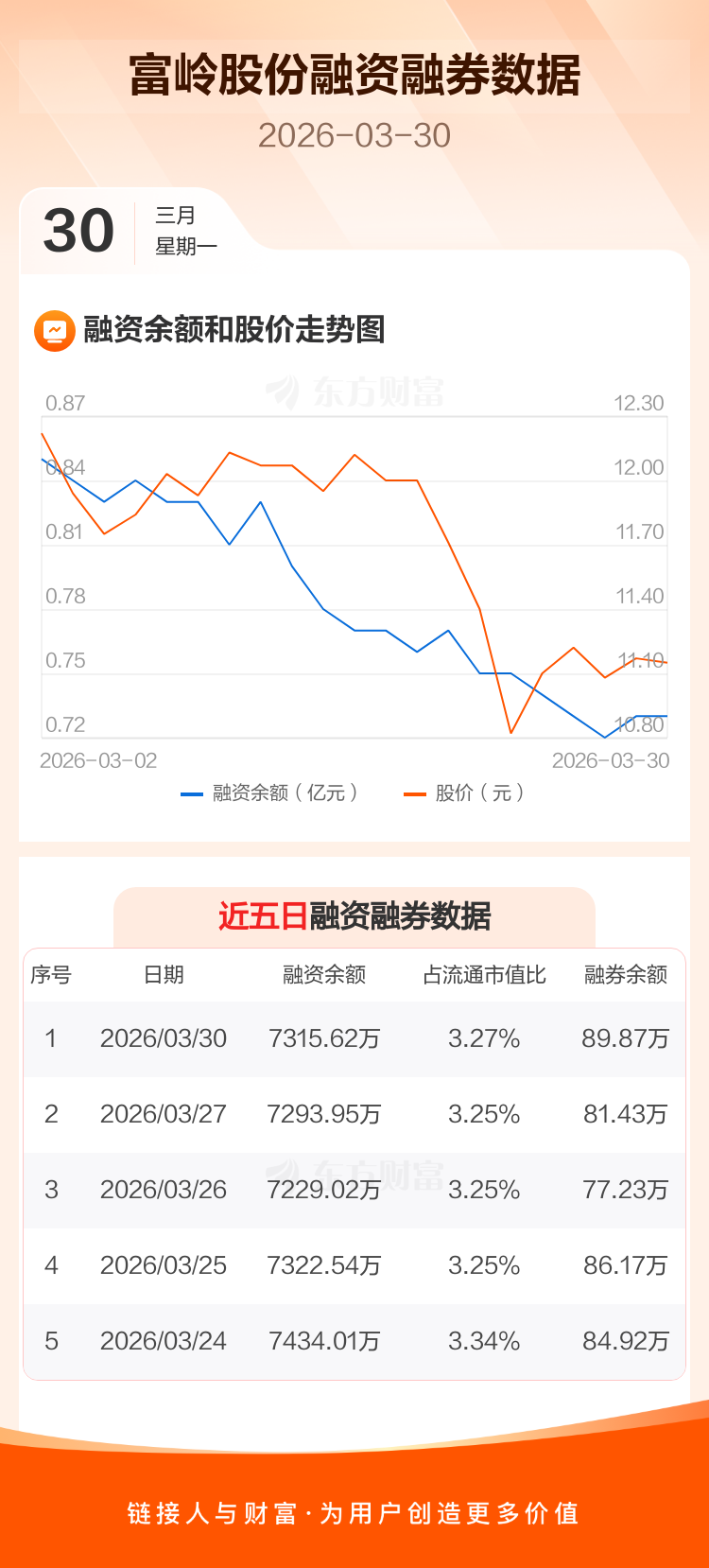 交易所最新数据显示,富岭股份于2026年3月30日获融资买入170.34万元,融资偿还148.66万元,当日融资净买入21.67万元。目前,该股融资余额7315.62万,占流通市值比例为3.27%。