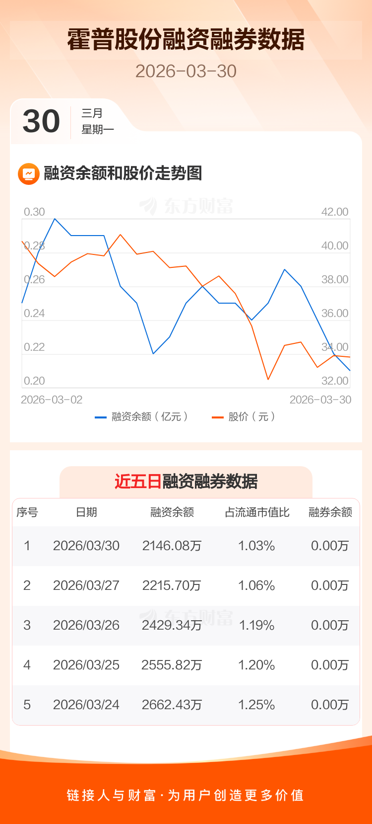交易所最新数据显示,霍普股份于2026年3月30日获融资买入248.41万元,融资偿还318.03万元,当日融资净偿还69.62万元。目前,该股融资余额2146.08万,占流通市值比例为1.03%。