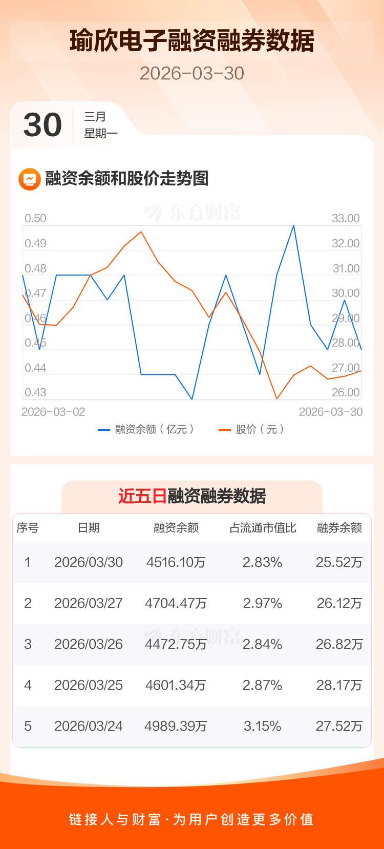 交易所最新数据显示,瑜欣电子于2026年3月30日获融资买入282.17万元,融资偿还470.55万元,当日融资净偿还188.38万元。目前,该股融资余额4516.10万,占流通市值比例为2.83%。