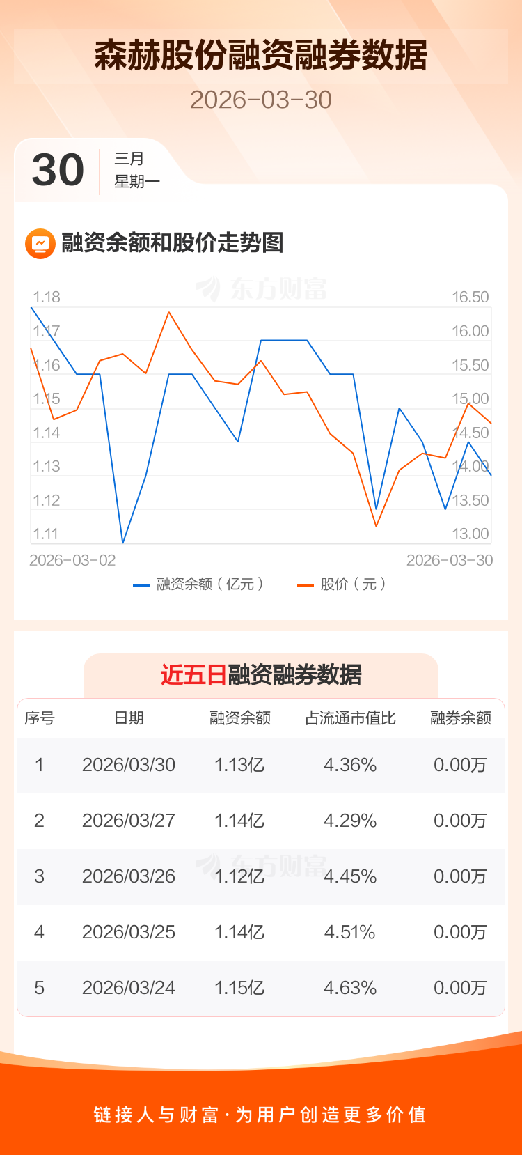交易所最新数据显示,森赫股份于2026年3月30日获融资买入419.84万元,融资偿还468.06万元,当日融资净偿还48.22万元。目前,该股融资余额1.13亿,占流通市值比例为4.36%。