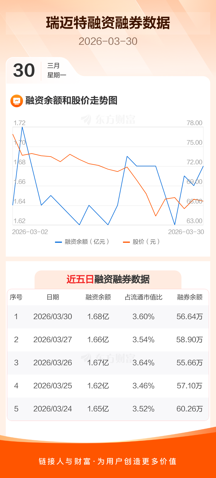 交易所最新数据显示,瑞迈特于2026年3月30日获融资买入366.59万元,融资偿还194.20万元,当日融资净买入172.39万元。目前,该股融资余额1.68亿,占流通市值比例为3.60%。