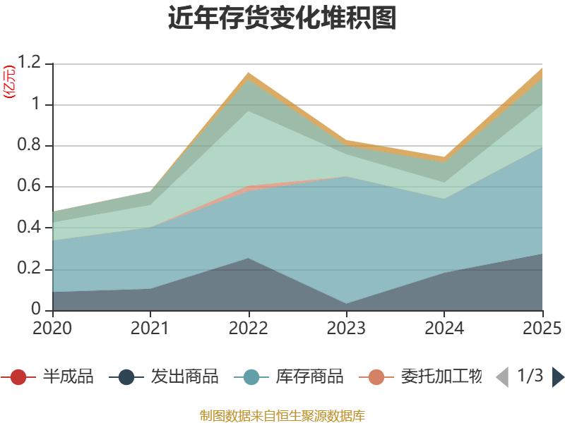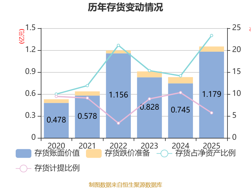 从存货变动来看,截至2025年末,公司存货账面价值为1.18亿元,占净资产的23.33%,较上年末增加4335.4万元。其中,存货跌价准备为713.66万元,计提比例为5.71%。