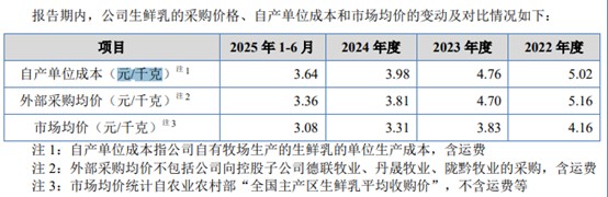 近年来,由于生鲜乳市场价格持续走低,南方乳业自有牧场生产成本显著高于外采价格,形成了“高价自产、低价外采”的成本倒挂。2022年,公司生鲜乳自产成本略低于外部采购均价。2023年,公司自产生鲜乳价格为4.76元/千克,超过同年外购均价4.7元/千克。2024年,公司自产价格和外购价格的成本倒挂幅度逐渐扩大。2025年,公司自产成本为3.64元/千克,超过外部采购成本0.28元/千克。
