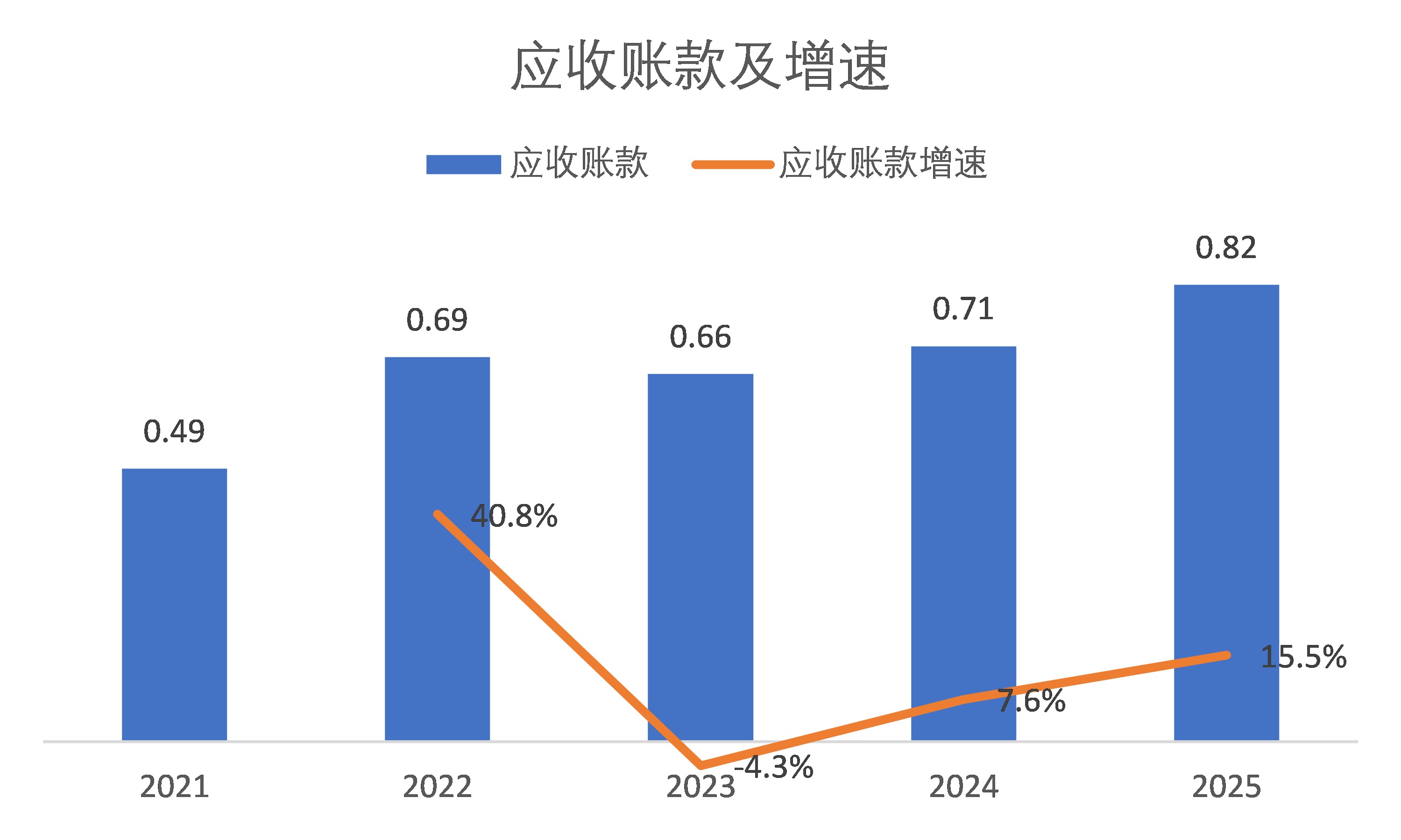 2024年南方乳业应收账款增速为7.45%,2025年应收账款增速为15.94%,不仅均快于同期营收增速,而且呈加速趋势。
