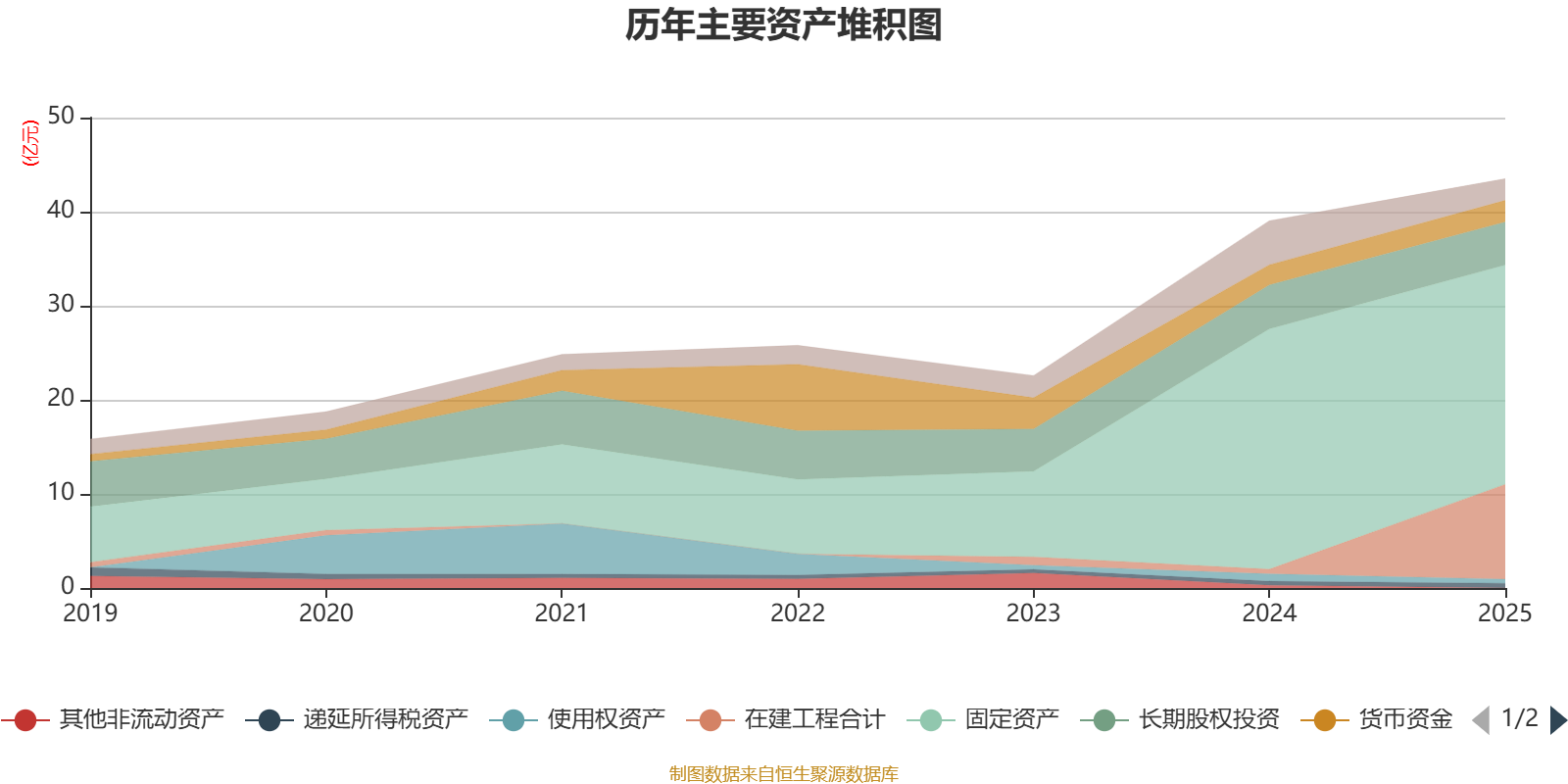 资产重大变化方面,截至2025年末,公司在建工程合计较上年末增加1917.85%,占公司总资产比重上升21.88个百分点;固定资产较上年末减少8.77%,占公司总资产比重下降11.87个百分点;其他流动资产较上年末减少78.84%,占公司总资产比重下降3.81个百分点;其他应收款(含利息和股利)较上年末减少46.59%,占公司总资产比重下降1.96个百分点。