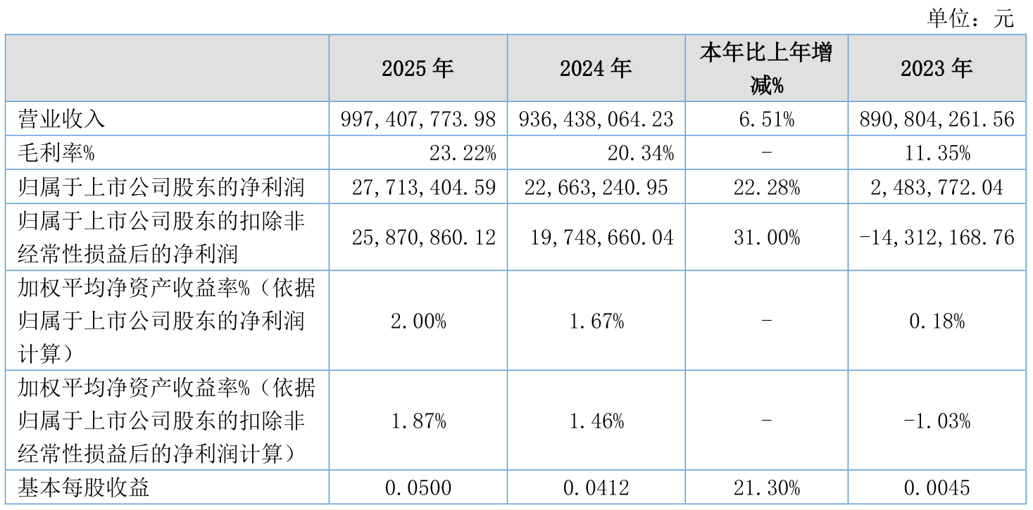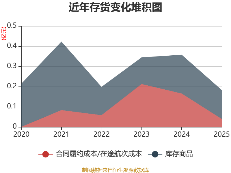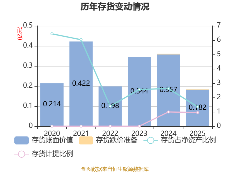 从存货变动来看,截至2025年末,公司存货账面价值为1823.9万元,占净资产的1.35%,较上年末减少1745.46万元。其中,存货跌价准备为17.47万元,计提比例为0.95%。