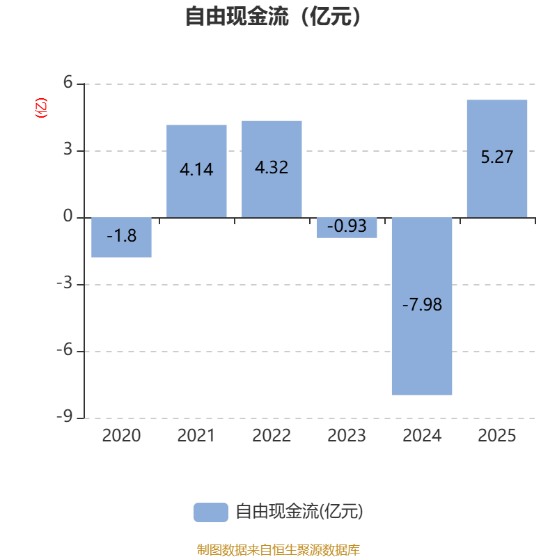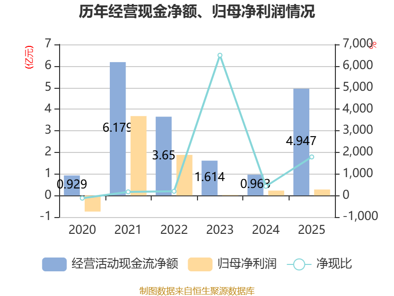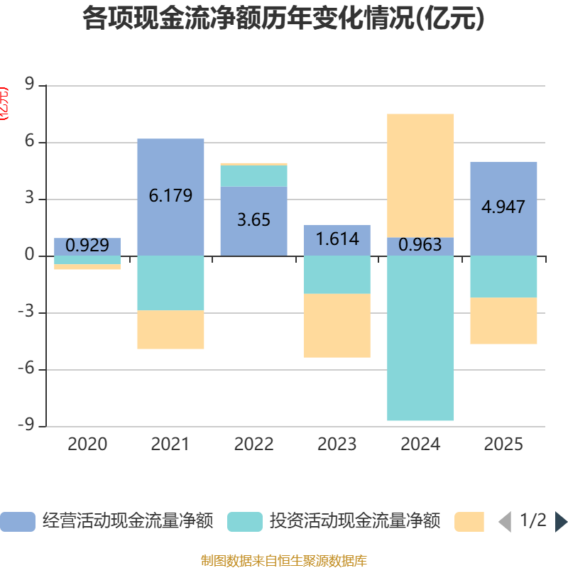 截至2025年,公司经营活动现金流净额为4.95亿元,同比增长413.8%;筹资活动现金流净额-2.45亿元,同比减少8.97亿元;投资活动现金流净额-2.22亿元,上年同期为-8.72亿元。
