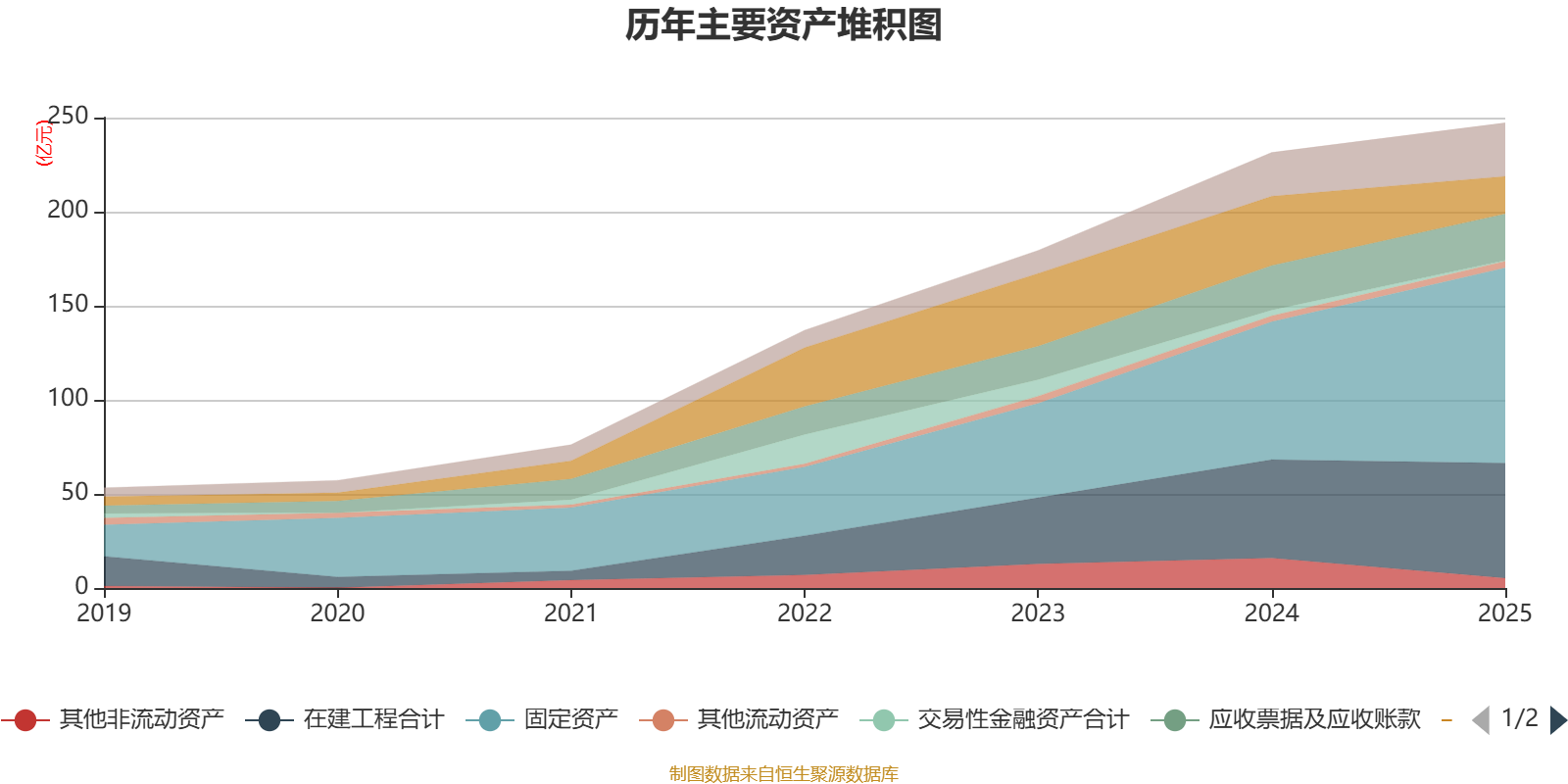 资产重大变化方面,截至2025年末,公司固定资产较上年末增加41.64%,占公司总资产比重上升10.33个百分点;货币资金较上年末减少45.83%,占公司总资产比重下降7.83个百分点;其他非流动资产较上年末减少67.22%,占公司总资产比重下降4.75个百分点;在建工程合计较上年末增加16.85%,占公司总资产比重上升2.12个百分点。