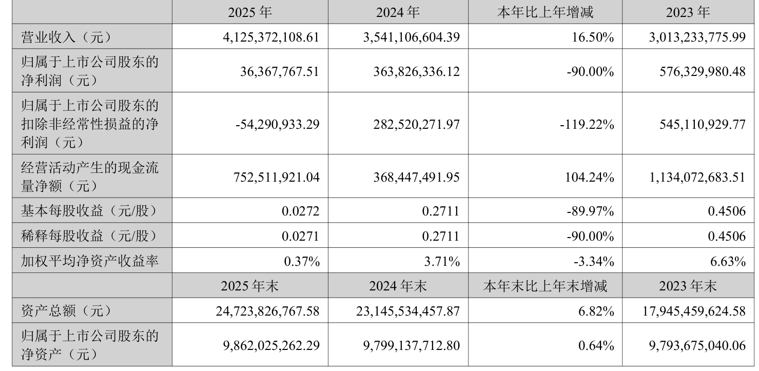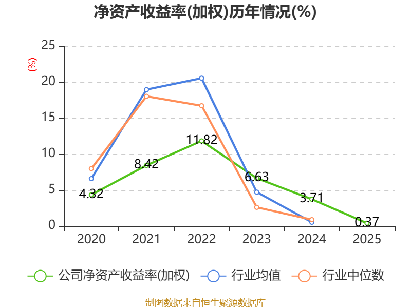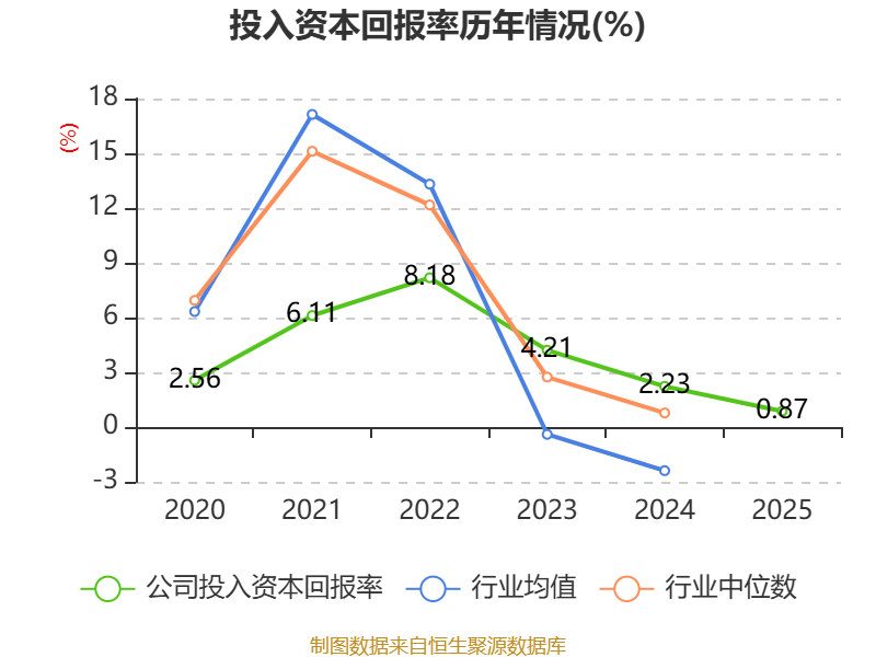 数据显示,2025年公司加权平均净资产收益率为0.37%,较上年同期下降3.34个百分点。公司2025年投入资本回报率为0.87%,较上年同期下降1.36个百分点。