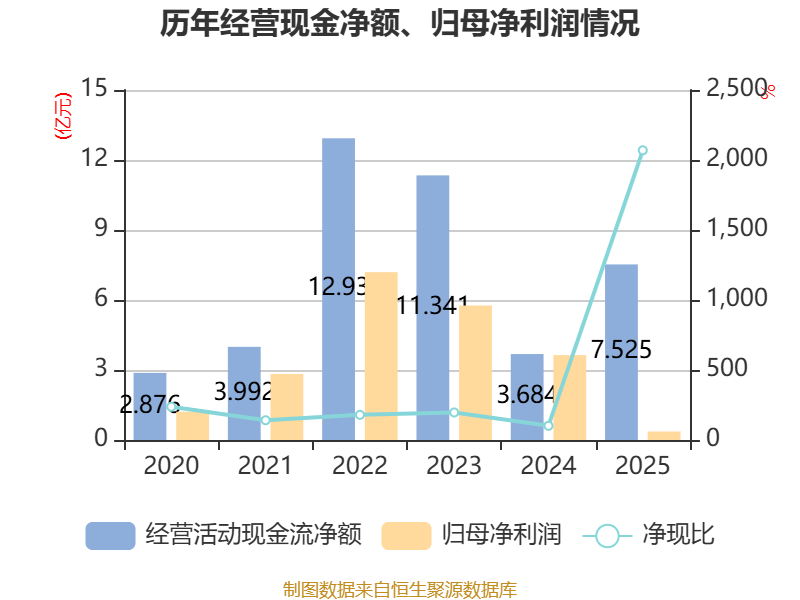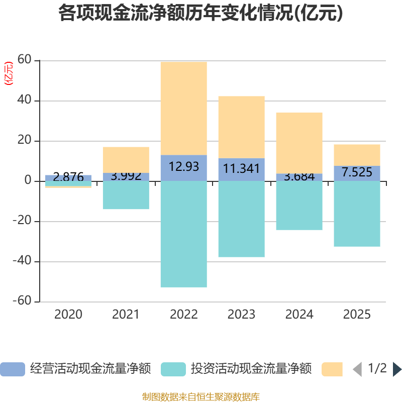 截至2025年,公司经营活动现金流净额为7.53亿元,同比增长104.24%;筹资活动现金流净额10.61亿元,同比减少19.7亿元;投资活动现金流净额-32.7亿元,上年同期为-24.44亿元。
