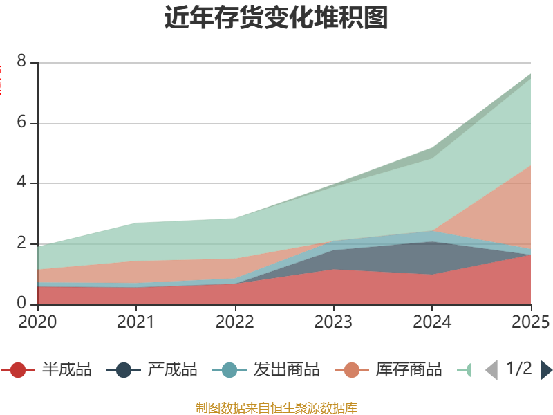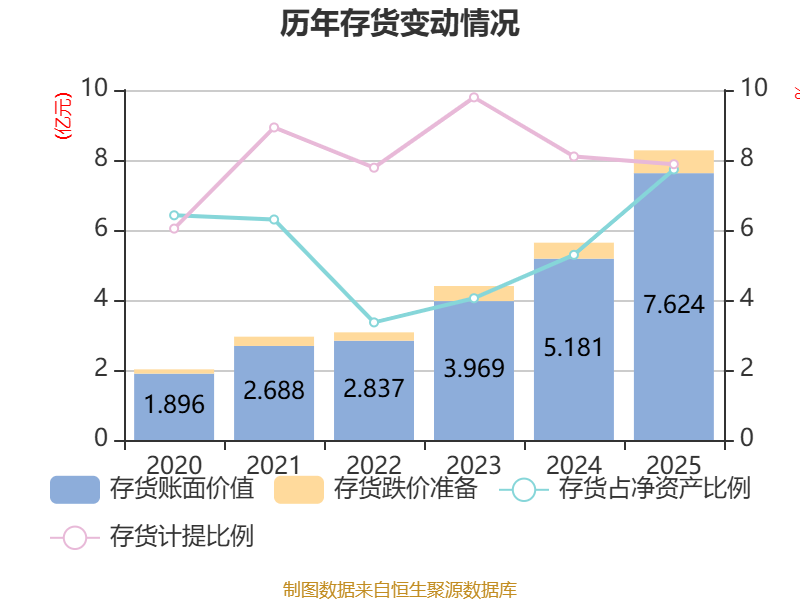 从存货变动来看,截至2025年末,公司存货账面价值为7.62亿元,占净资产的7.73%,较上年末增加2.44亿元。其中,存货跌价准备为6523.05万元,计提比例为7.88%。